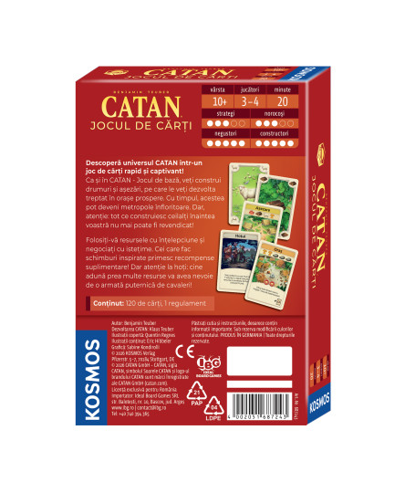 Ca si in popularul joc „Colonistii din Catan“, in acest extraordinar joc de carti este vorba despre folosirea resurselor in mod optim pentru a acumula puncte castigatoare. Se construiesc drumuri. Apar soldatii ! Se intemeiaza asezari care apoi sunt dezvoltate in orase. Comertul infloreste iar in orase se ridica cladiri monumentale ! Fiti atenti: drumurile si soldatii se pot pierde in favoarea altui jucator. Astfel punctele voastre castigatoare nu sunt totdeauna protejate. Arata ca ai calitatile necesare pentru a fi un colonist de succes !